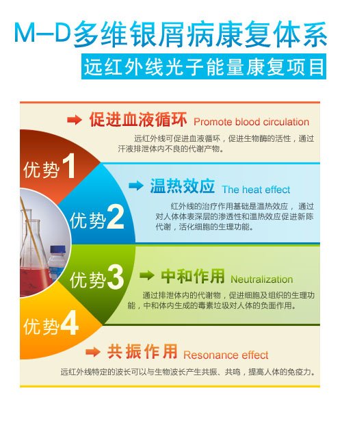 远红外线光子能量康复项目利用频谱中远红外线光子能量和不同的彩光光谱照射在人体上,加速血液循环、促进身体的新陈代谢、增强人体免疫力和抗病能力,达到银屑病抗复发的目的。